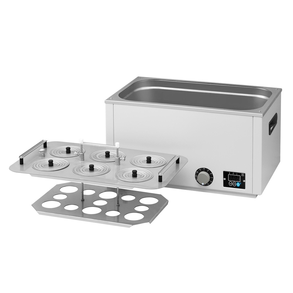 Универсальная баня ЛБ63 оснащена легко извлекаемой корзиной с подвижным дном для размещения лабораторной посуды различного размера и стальными концентрическими кольцами для ее уплотнения.