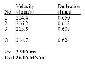 Груз известного веса падает с фиксированной высоты, воздействуя при этом с определенной силой удара на нагрузочную плиту. Нагрузочная плита под действием силы удара вызывает осадку грунтового основания. Ускорение, скорость и величина осадки подвергаются электронной обработке и рассчитывается динамический модуль упругости (Evd)