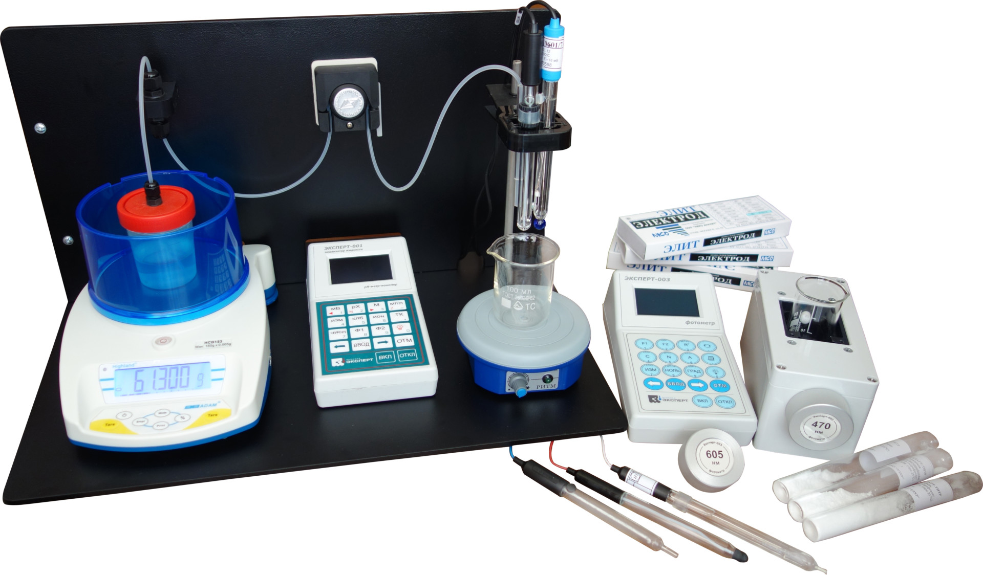 Комплект включает оборудование для автоматического титрования двумя методами: потенциометрическим (измерение ЭДС электродных систем анализатором «Эксперт-001») и фотометрическим (измерение оптической плотности раствора при изменении его окраски фотометром «Эксперт-003»). Представляет собой комплект «Титрион-1-3» (или «Титрион-1-3А»), укомплектованный электродными системами и сменными источниками излучения.