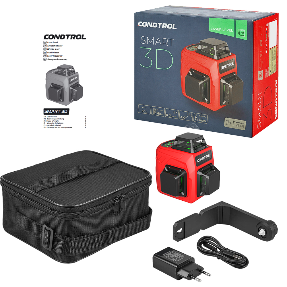 Нивелир лазерный Condtrol Smart 3D позволяет строить плоскости с углом развертки 360°. Оснащен системой автоматической компенсации наклона корпуса и опцией проекции наклонных плоскостей. Способен проецировать две вертикальные и одну горизонтальную плоскости. Используется в закрытых помещениях и на открытых строительных площадках.