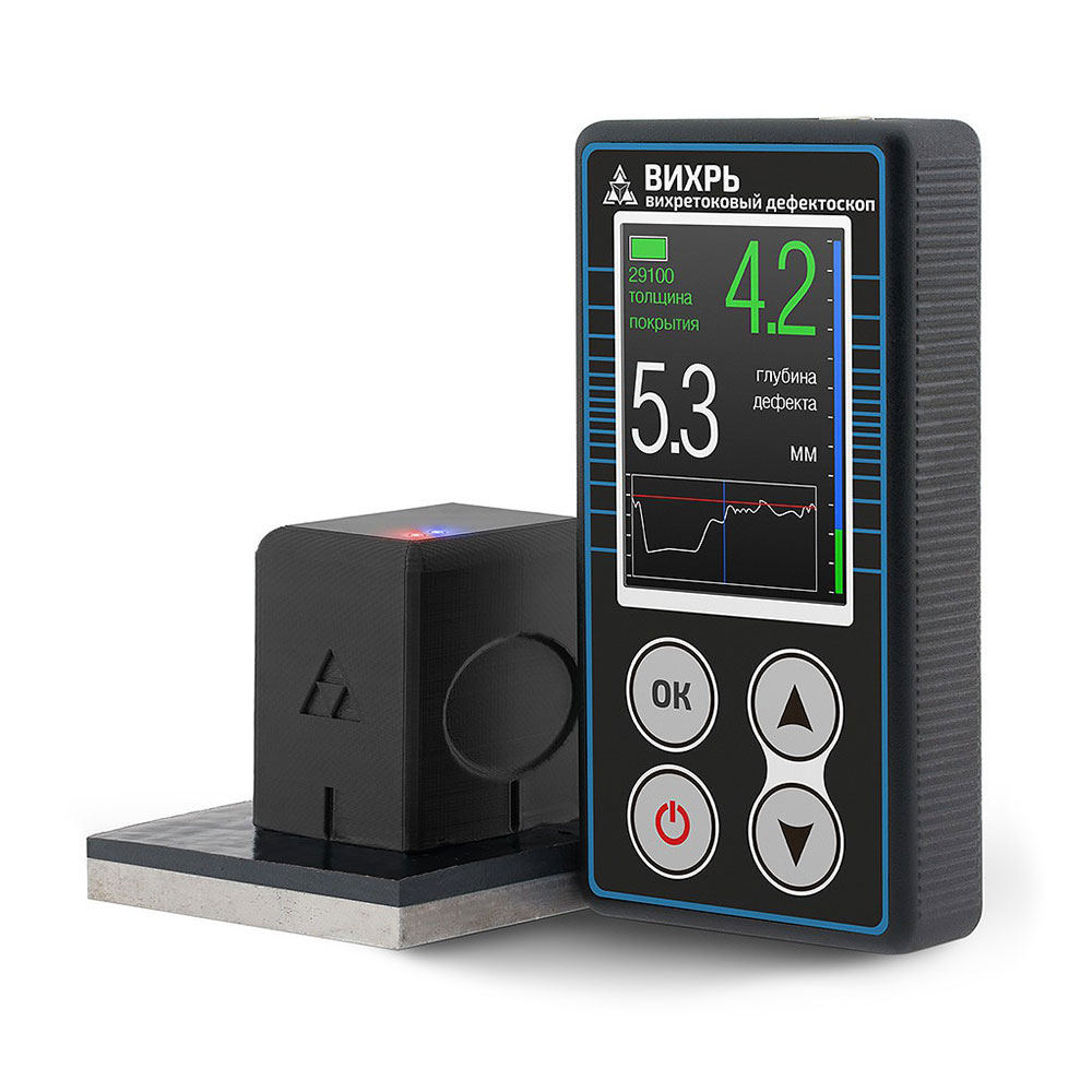 При сканировании материала дефектоскоп Вихрь совмещает два метода: магнитный и вихретоковый. Благодаря этому можно контролировать конструкции с грубой и загрязненной поверхностью, а также вести измерения сквозь изолирующее покрытие или слой коррозии. Для исследования материалов с покрытием, имеющим переменную толщину, не требуется внесение дополнительных настроек.