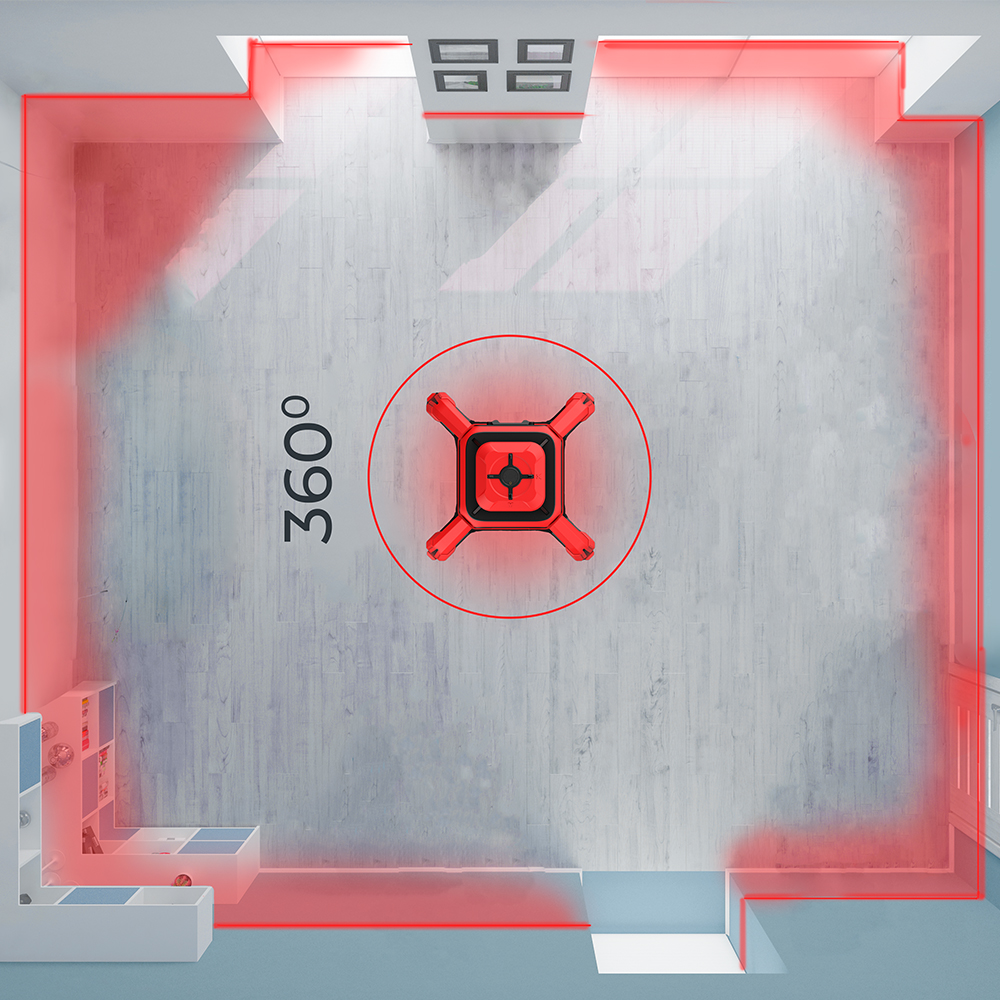• Лазер проецирует горизонтальную плоскость на 360º, а также точки зенит и надир . Чтобы построить вертикальную плоскость, достаточно повернуть прибор на бок.