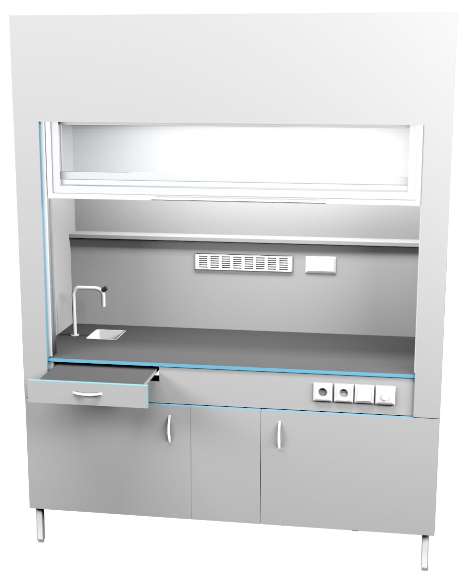 Шкаф вытяжной с сантехникой ШВ НВК 1800 ПП+ (1800×716×2200). Описание: Вытяжные лабораторные шкафы применяются при работе с токсичными и вредными летучими материалами, с чистыми материалами, с растворением или разложением под температурной обработкой, при проведении анализа проб и многих других. Особенности: Полипропиленовая раковина, обладающая высокой химической стойкостью Химически стойкий кран из латуни с полипропиленовым напылением для подключения холодной воды Дополнительная подсветка сбоку с плавной регулировкой Выдвижной столик Вытяжка из нижней тумбы позволяет хранить в ней реактивы Ударопрочный подъемный кран легко поднимается одной рукой Экран в поднятом состоянии не увеличивает высоту шкафа Внутри рабочей камеры полочка для хранения реактивов Две влагозащищенных розетки с крышкой внутри рабочей камеры Специальные доводчики в тумбе позволяют закрывать тумбу бесшумно По заказу столешницы могут быть выполнены из: химстойкого пластика керамогранита (плитка) полипропилена нержавеющей стали монолитной керамики эпоксидного керамзита