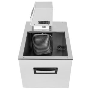 • Для работы при температурах ниже температуры окружающей среды термостат имеет встроенный теплообменник для подключения к водопроводу или проточному охладителю.