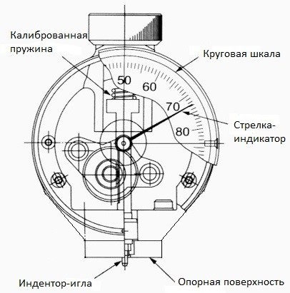 При нажатии на вершину дюрометра, установленного на испытуемую поверхность, индентор перемещается внутрь корпуса дюрометра и передаёт усилие сопротивления материала через рейку к зубчатой передаче стрелки-индикатора, которая поворачивается на определённый угол, выражаемый по шкале единицами Шора (метод вдавливания).
