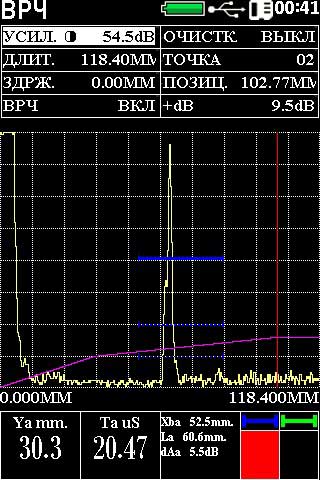 • режимы: огибающей, заморозки и отображения хода луча для удобства проведения дефектоскопии