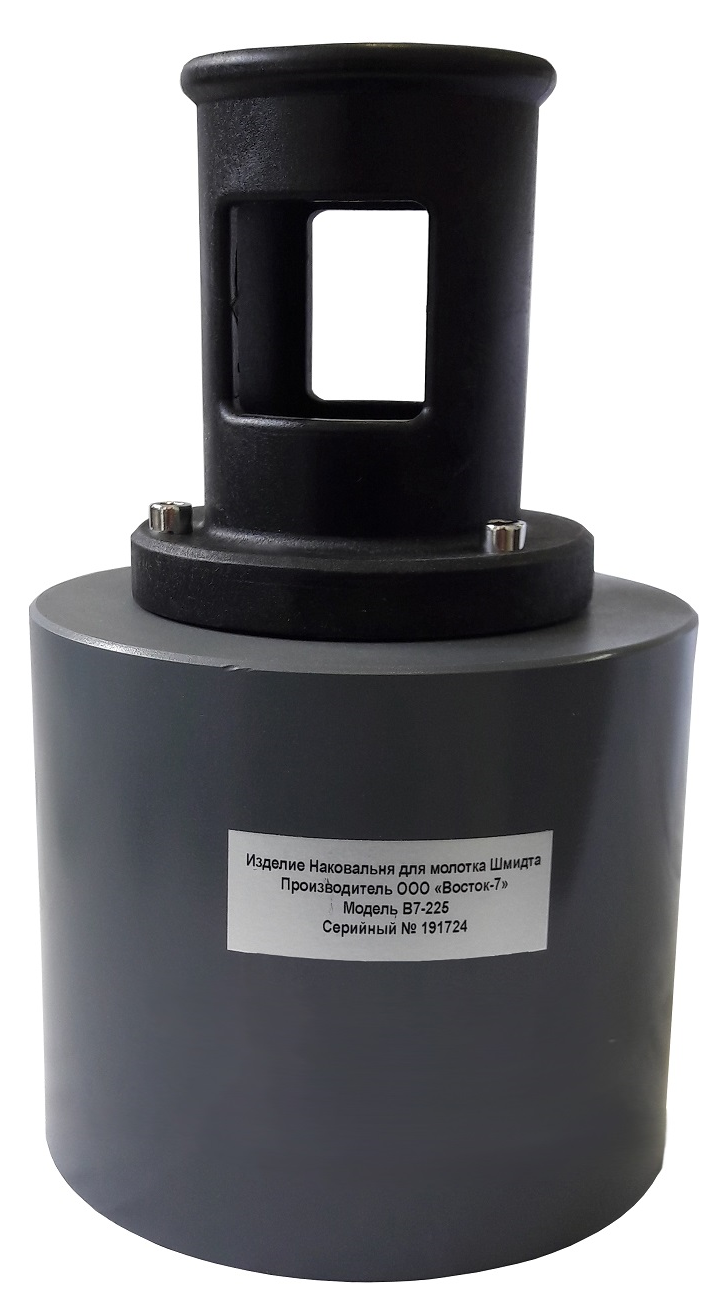 Наковальня состоит из массивного цилиндрического основания, в которое запрессована тестовая пластина из закалённой инструментальной стали, и направляющей гильзы, закреплённой на основании и обеспечивающей строго перпендикулярное положение склерометра при ударе.