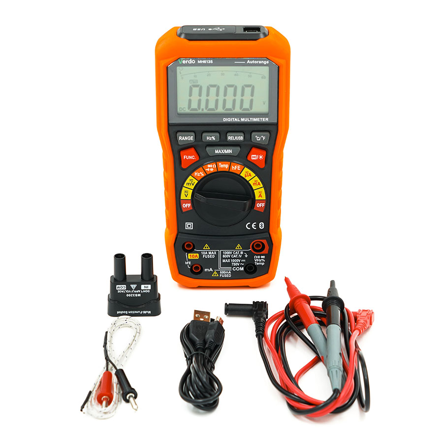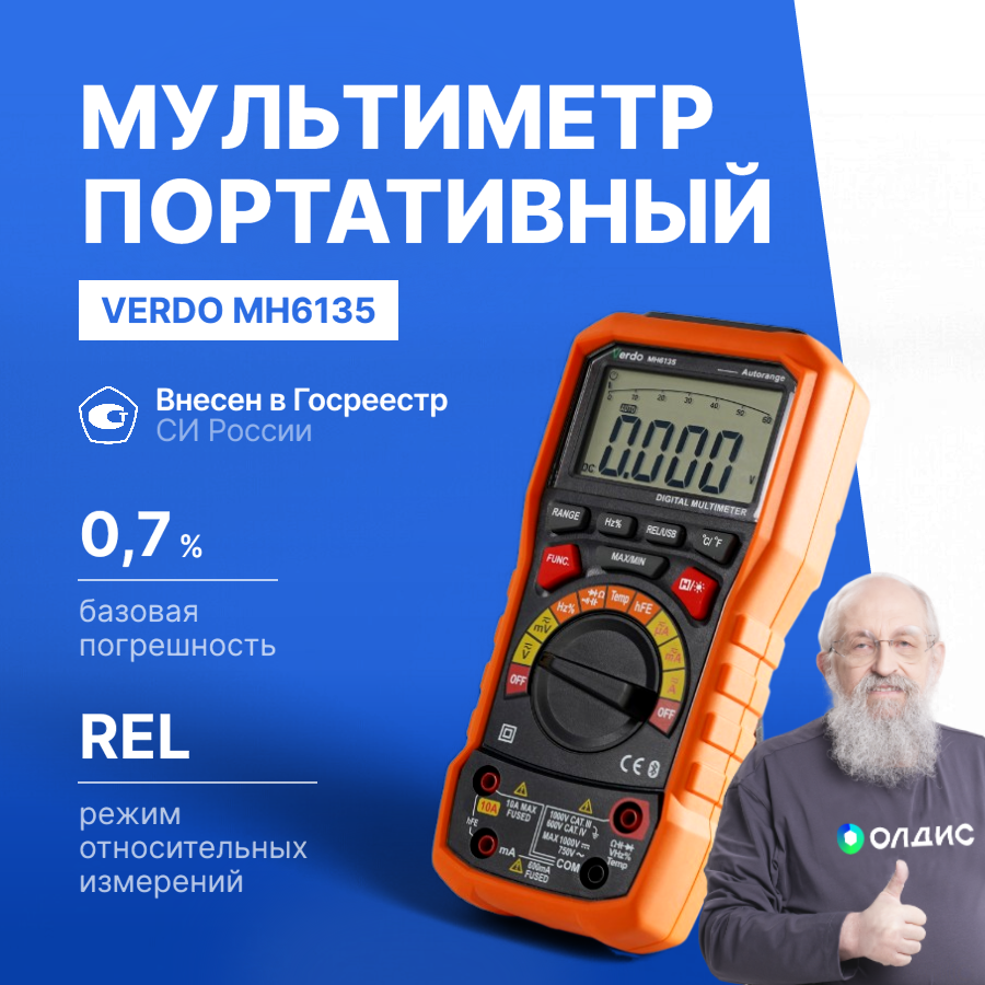 Мультиметр VERDO MH6135 – это многофункциональный ручной цифровой мультиметр с функцией отображения истинного среднеквадратичного значения (TrueRMS), большим многострочным жидкокристаллическим дисплеем с аналоговой шкалой, что облегчает считывание показаний. Передача измеренных значений величин в ПО обработки. Этот многофункциональный измерительный прибор идеально подходит как для профессионального использования на производстве, ремонта и сервисного обслуживания, так и для обучения и бытового применения.
